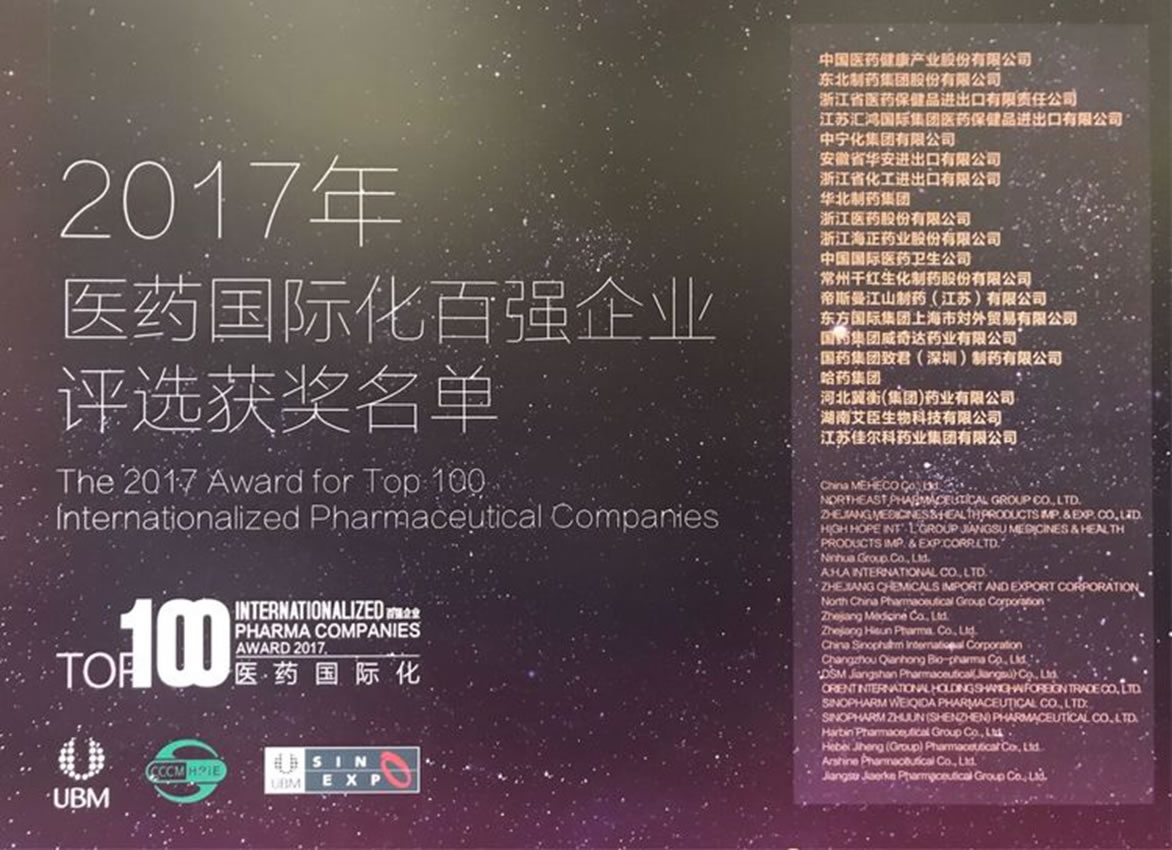 2017年6月19日,由中國醫(yī)藥保健品進(jìn)出口商會主辦的"第八屆中國與世界醫(yī)藥企業(yè)家高峰會;中國醫(yī)藥產(chǎn)業(yè)國際化榜樣與行動",在上海國際會議中心隆重召開,2017年度醫(yī)藥國際化百強(qiáng)企業(yè)評選獲獎名單在高峰會上正式發(fā)布。