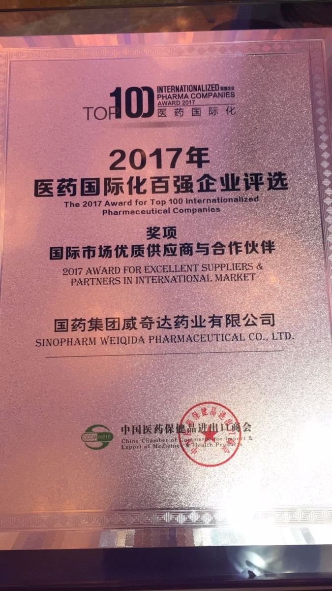 國藥威奇達(dá)獲評“2017年醫(yī)藥國際化百強(qiáng)企業(yè)—國際市場優(yōu)質(zhì)供應(yīng)商與合作伙伴”
