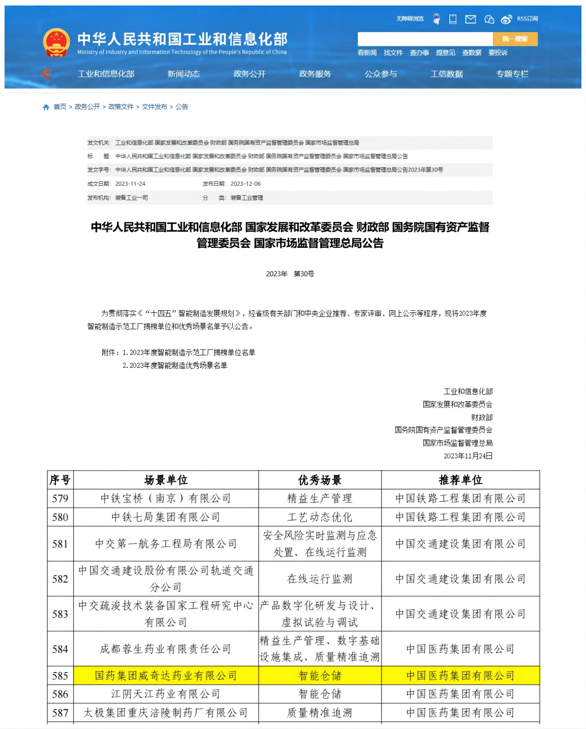 12月6日,工業(yè)和信息化部等五部門聯(lián)合發(fā)布2023年度智能制造示范工廠揭榜單位和優(yōu)秀場景名單。國藥威奇達(dá)“智能倉儲”項目成功入選2023年度智能制造優(yōu)秀場景。