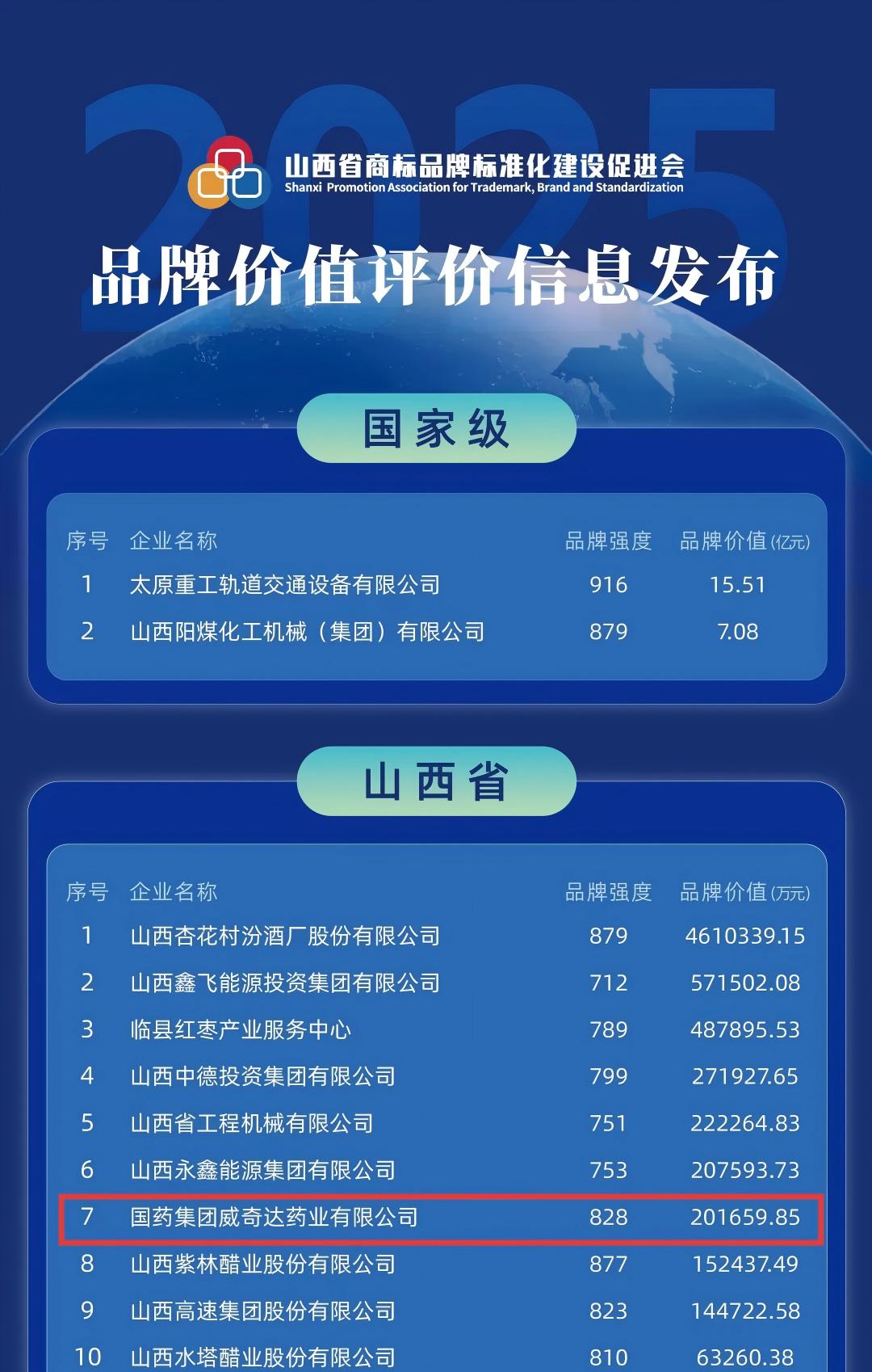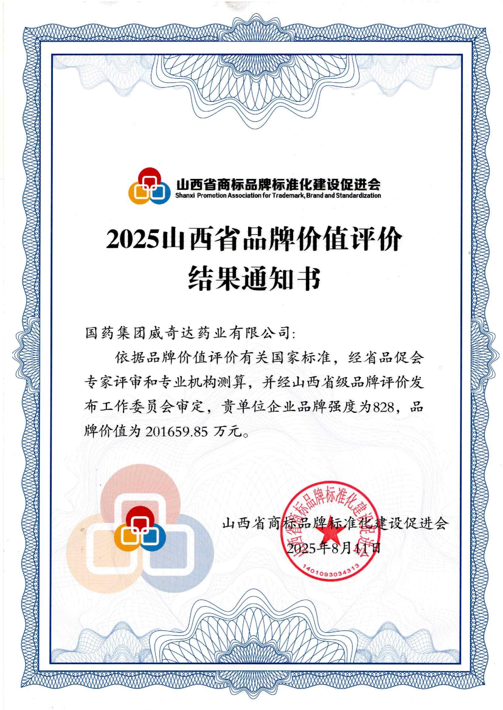 8月11日,首屆山西省品牌促進(jìn)大會(huì)暨2025年度山西省品牌價(jià)值評(píng)價(jià)信息發(fā)布會(huì)在太原召開(kāi)。會(huì)上進(jìn)行了2025年度山西省品牌價(jià)值評(píng)價(jià)信息發(fā)布,國(guó)藥威奇達(dá)以20.17億元的品牌價(jià)值在榜單中名列前茅。?