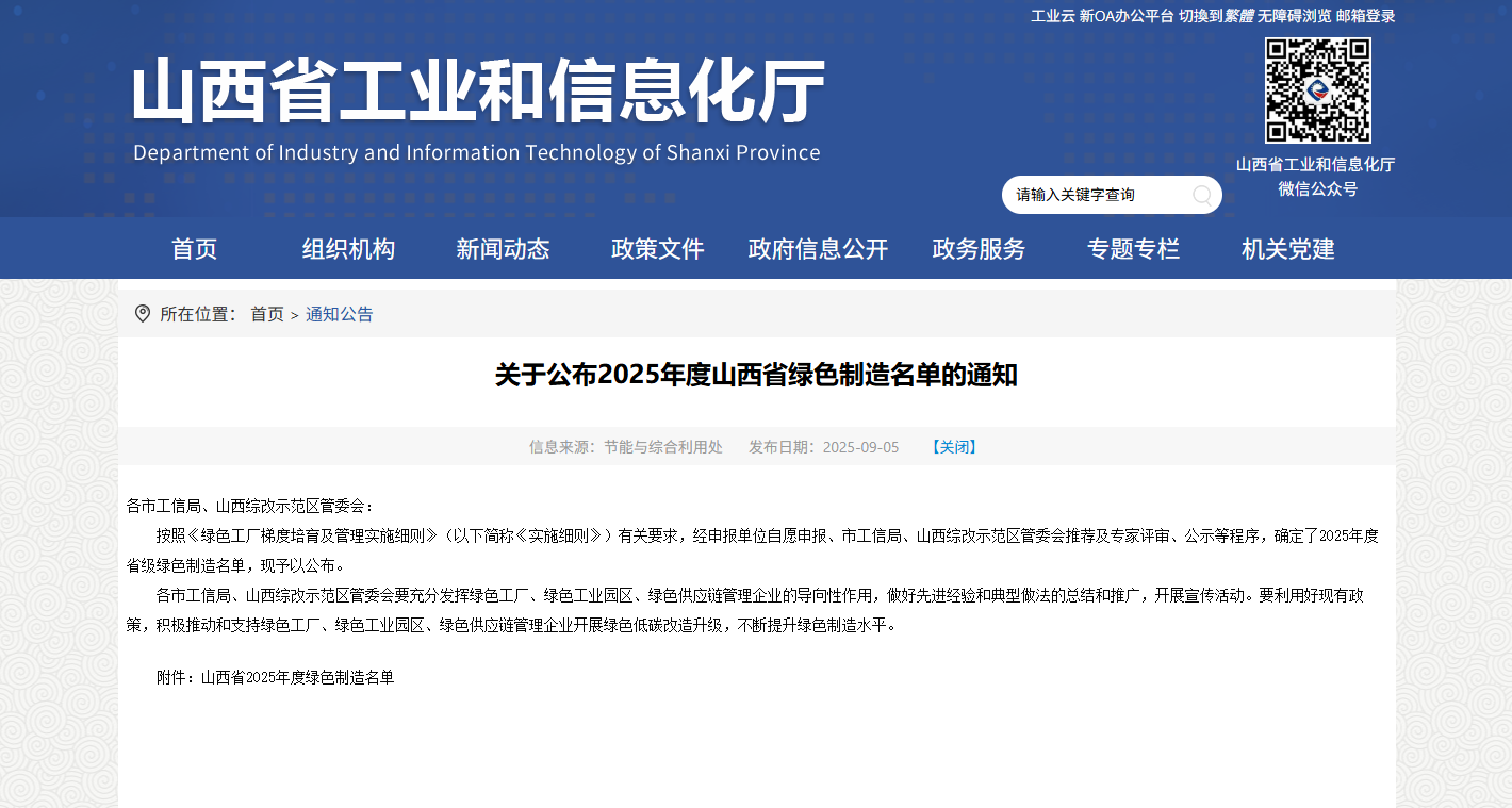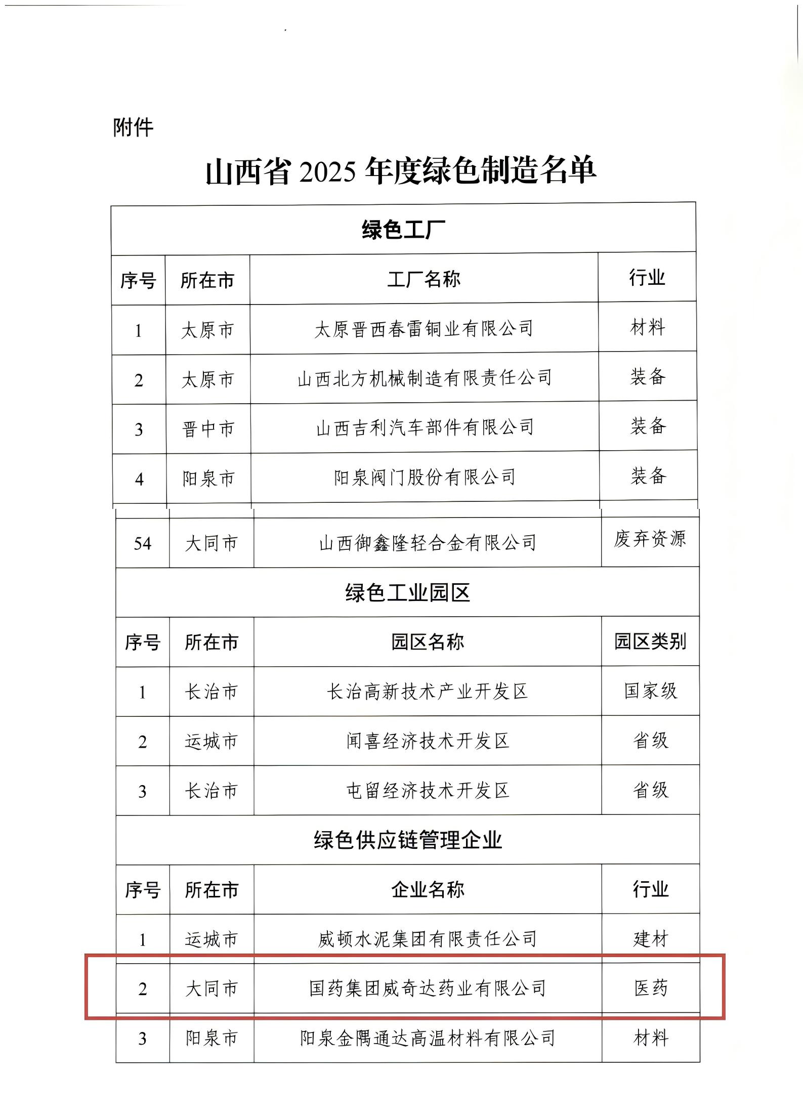 近日,山西省工業(yè)和信息化廳公布山西省2025年度綠色制造名單,國藥威奇達成功上榜,成為山西省“綠色供應(yīng)鏈管理企業(yè)”。?